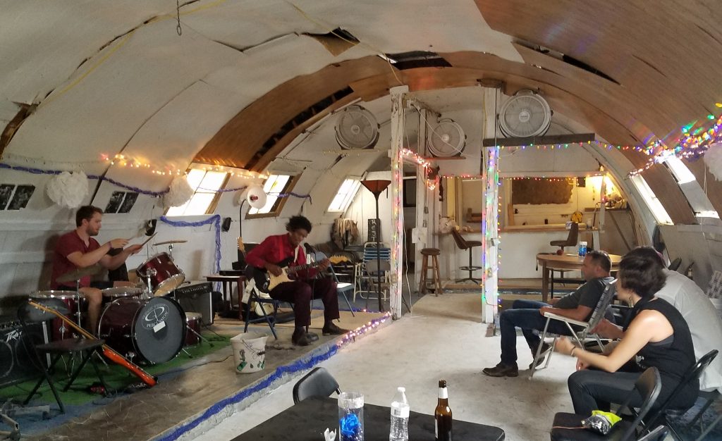 On a music site I’d seen notice of the nearby opening of a country juke joint called Wonder Light City. We drove about 18 miles out of town as dark clouds rolled in, from divided asphalt to two-lane country road to gravel as the rain was coming down in blinding sheets and we slowed to a crawl. It seemed much further than I thought. Just when I was about to turn around, we passed a wind-blocking line of trees to find a clearing with a demolished mobile home, a makeshift outdoor stage, and a Quonset hut painted blue and festooned with Christmas lights. Just inside there was a scattering of card tables, a stage made of pallets and plywood, and Robert “Bilbo” Walker, 80, in a maroon polyester ensemble and what looked like a Little Richard wig, and talking to a tourist family. Everyone was in a state of waiting. Robert explained that his band was severely delayed by the weather. I made my way to the back of the hut to a Formica-covered bar and a small woman who later was revealed as Robert’s wife and a soon-to-be bassist. She offered me the choice of Miller Lite or Bud Light and I chose two of the former and went back into the conversation. I mentioned offhand that Ken was a drummer and within minutes Robert was asking Ken to set up the drum kit the way he wanted so they could start. The old man spent a good 15 minutes tuning and trying to shake out the ground buzz from his amp patch cord until we hustled up another in the tangle of wiring at the side of the stage. Then he spent another 10 minutes helping his wife tune her bass, which was a full tone off, and teaching her how to play three notes in this sequence: A, D, E, which meant all the tunes had to be in the key of A. Then the bluesman started up a basic riff and off they went, Ken holding off until he caught the cadence. Robert had a fine, ragged guitar tone and a voice like Hound Dog Taylor. It all kind of came together and the family and I sat there as this pick-up band went through about a dozen songs. It must have been the poison ant bites at the Crossroads which filled Ken with some sort of preternatural rhythmic chops.